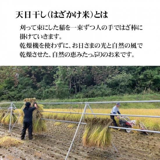 お日様のパワーをしっかり吸い込んで、天日干し米は追熟され、全ての米つぶが美味しくなります。甘味ともっちり感が病みつきになるお米です。